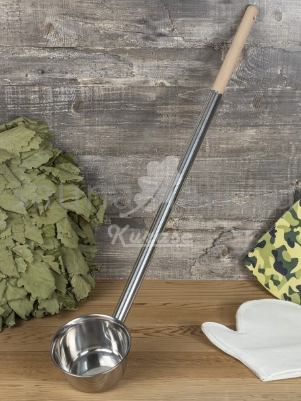 Объем 500 мл. Длина банного инвентаря 70 см, диаметр ковшика 12 см. Ручка выполнена и дерева бук, низкой теплопроводности. Длинная ручка позволит не приближаться к раскаленной печи. Для максимальной защиты рук от термического воздействия применяйте специальные войлочные рукавицы для бани. Металлическая часть ковша выполнена и полированной нержавеющей стали, что придает ковшу эстетичный внешний вид и предотвращает образование ржавчины, что значительно увеличивает срок службы изделия.
