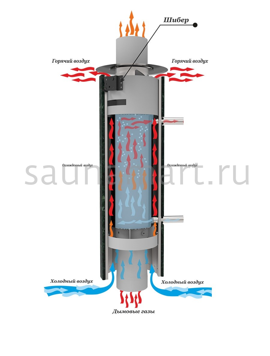 Дымоход с регистром – комбинированная конструкция, объединяющая дымоотводящий канал и водяной теплообменник. Выполняется из жаропрочной стали (3-5 мм) с приваренными трубами или пластинчатыми секциями, образуя прямоугольный или цилиндрический корпус. Подключается к системе отопления через патрубки (диаметром 1-1.5"), позволяя нагревать воду до 70-80°C. Особенности: обязательное наличие расширительного бака, рекомендуется для помещений площадью свыше 100 м?. Минимальная высота установки – 2 м от уровня печи.