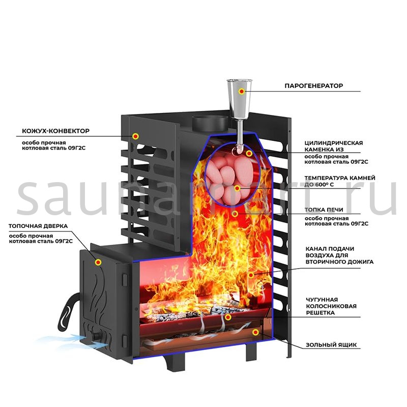 • Материал закрытой каменки: особо прочная котловая сталь 09Г2С