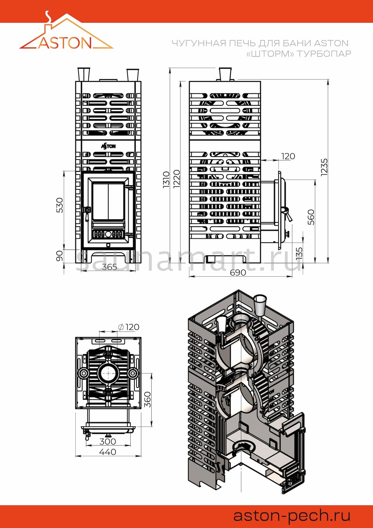 Особенности модификаций: Чугунные печи ASTON и ASTON "Шторм Турбопар" представлены в нескольких модификациях, отличающихся длиной топочного тоннеля. Модели с обозначением "б/в" (без выноса) не имеют выноса и предназначены для обслуживания из парной. Стандартные модификации и версии Long позволяют топить печь из предбанника, при этом толщина стены может достигать 14 см для стандартных моделей и 28 см для модификации Long.
