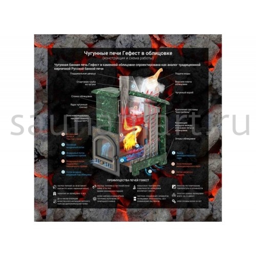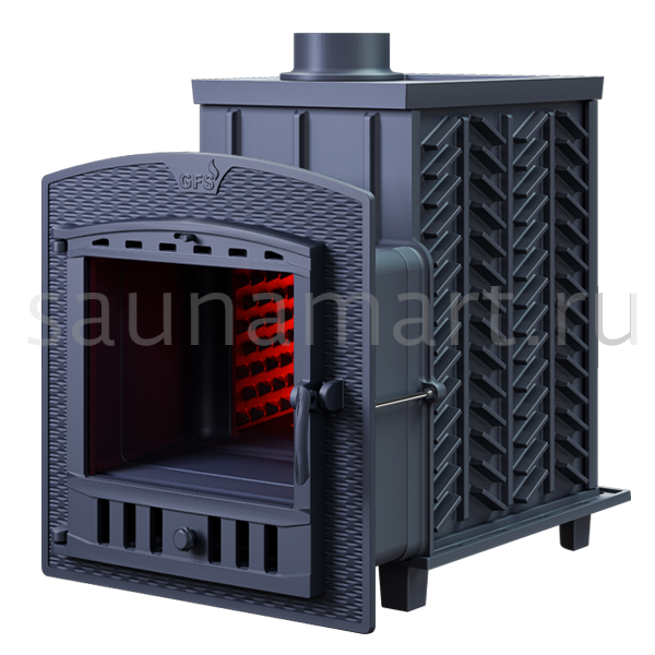 GFS-ЗК 40 (П)2 - печь с усиленной каменкой большей массы, с единым углублением внутрь топки для дополнительной укладки чугунного заряда. Теплосъемные шипы, со стороны горения пламени, в разы увеличивают площадь соприкосновения огня с каменкой и ускоряют передачу тепла, а также способствуют лучшему дожигу, смешивая потоки пламени и воздуха, поступаемого из воздушника. Эти усовершенствования значительно повышают мощность парообразования печи и выдают большее количество пара при непрерывной подаче воды. Каменка печей GFS-ЗК является незаливаемой.