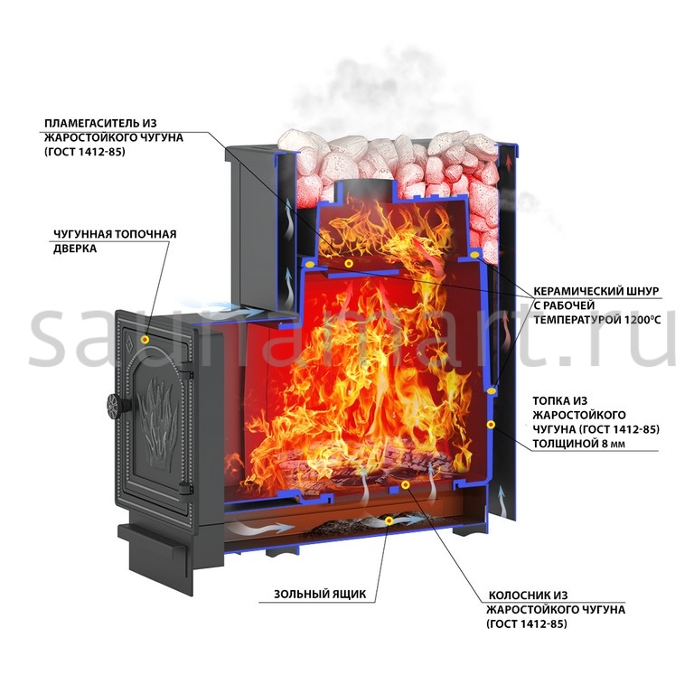 • Высокая теплоотдача: Обеспечивает быстрое и равномерное нагревание, создавая комфортные условия для парения.