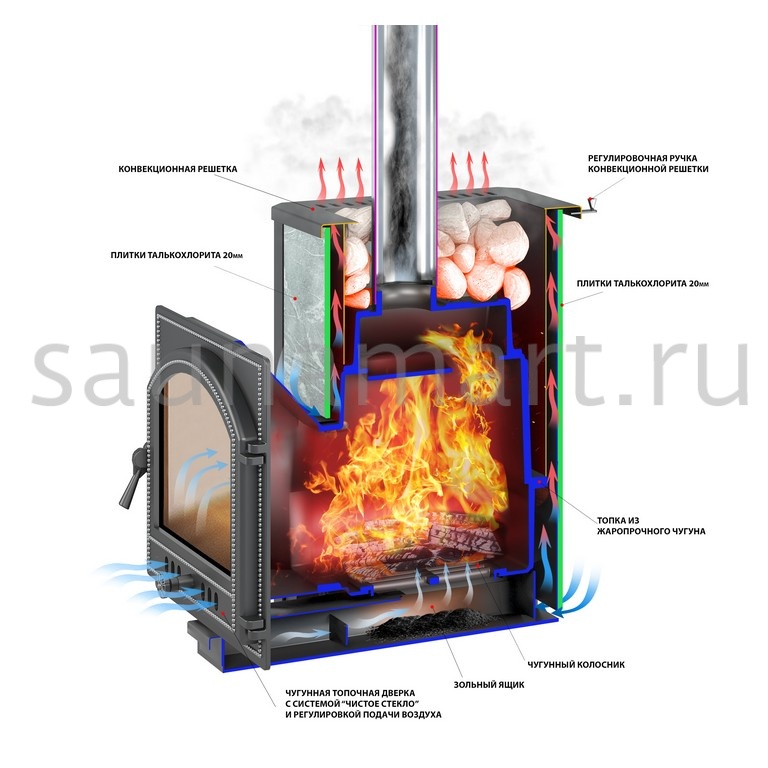 Преимущество печи в том, что топка печи состоит из 3-х чугунных элементов. На стыке между ними используется керамический шнур с рабочей температурой 1200 градусов. То есть топка печи абсолютно герметична! Для фиксации деталей между собой применяется болтовое соединение, что даёт 100% гарантию безопасности при эксплуатации. Теплоёмкая конвекционно–вентилируемая облицовка из экологически чистой горной породы позволяет камню в короткие сроки нагреваться и удерживать стабильную температуру в парильном помещении максимально долго, а также гасить жёсткое инфракрасное излучение.