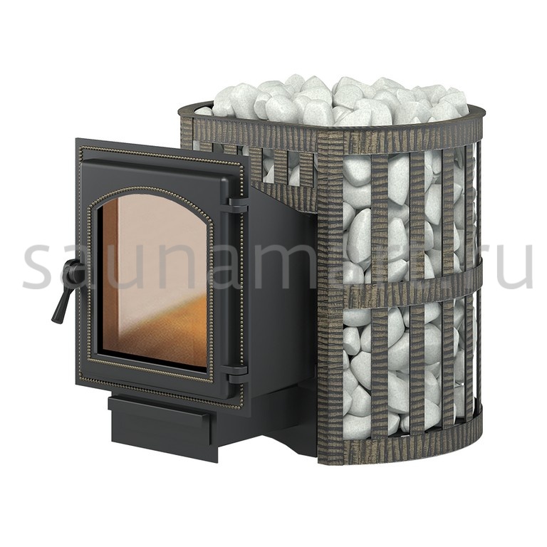 Банная чугунная печь Легенда Ковка 12 (220) укомплектована чугунной герметичной дверцей Везувий 220 с жаропрочным стеклом «SCHOTT ROBAX». Конвекционно-вентилируемый кожух "Ковка" изготовлен из металлической текстурированной полосы, покрашенной термостойкой краской и покрытой патиной «Бронза».