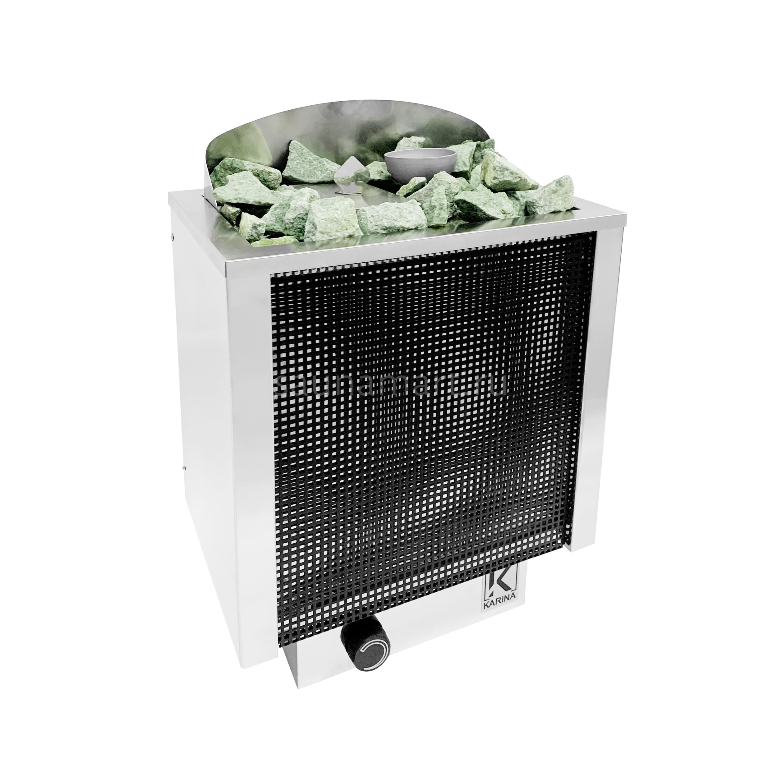 Электрокаменка Karina Optima Steam 9 предназначена для использования в парных объемом от 12 до 14 м3. Печь выполнена в настенном варианте со встроенным регулятором температуры. Напряжение питания печи 220/380В. Данная печь имеет 3 тэна, между которыми расположен бак для воды (который является парогенератором и одновременно фитозапарником для трав) и емкость в виде закрытой каменки с воронкой для получения мелкодисперсного пара. В закрытую каменку мы рекомендуем закладывать шары из нержавейки для более правильного эффекта. Обе емкости можно достать из печи для последующей очистки/мойки от налёта. Электрокаменка Karina Optima Steam многофункциональна, и при правильной эксплуатации она подойдет для любителей как финской сауны, так и русской бани. Если в парогенератор не заливать воду, парная разогреется до высокой температуры (100 -120 ?) с относительной влажностью воздуха 10-12% - режим сухой бани (финская сауна). Если залить воду в парогенератор, то при разогреве парной вода будет испаряться и увлажнять воздух в парной до режима русской бани (60-70 ? и 35-45% влажности).