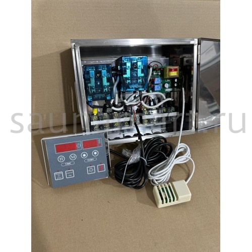 Пульт управления элeктрoкaмeнкой (электропечью для сауны) ПУЭКМ "Ресурс" цифровой программируемый до 36 кВт включительно. Пульт устанавливается в предбаннике, а датчик заводится в парилку. Длина кабеля с датчиком температуры 3 метра. Датчик с кабелем идут в комплекте с пультом.