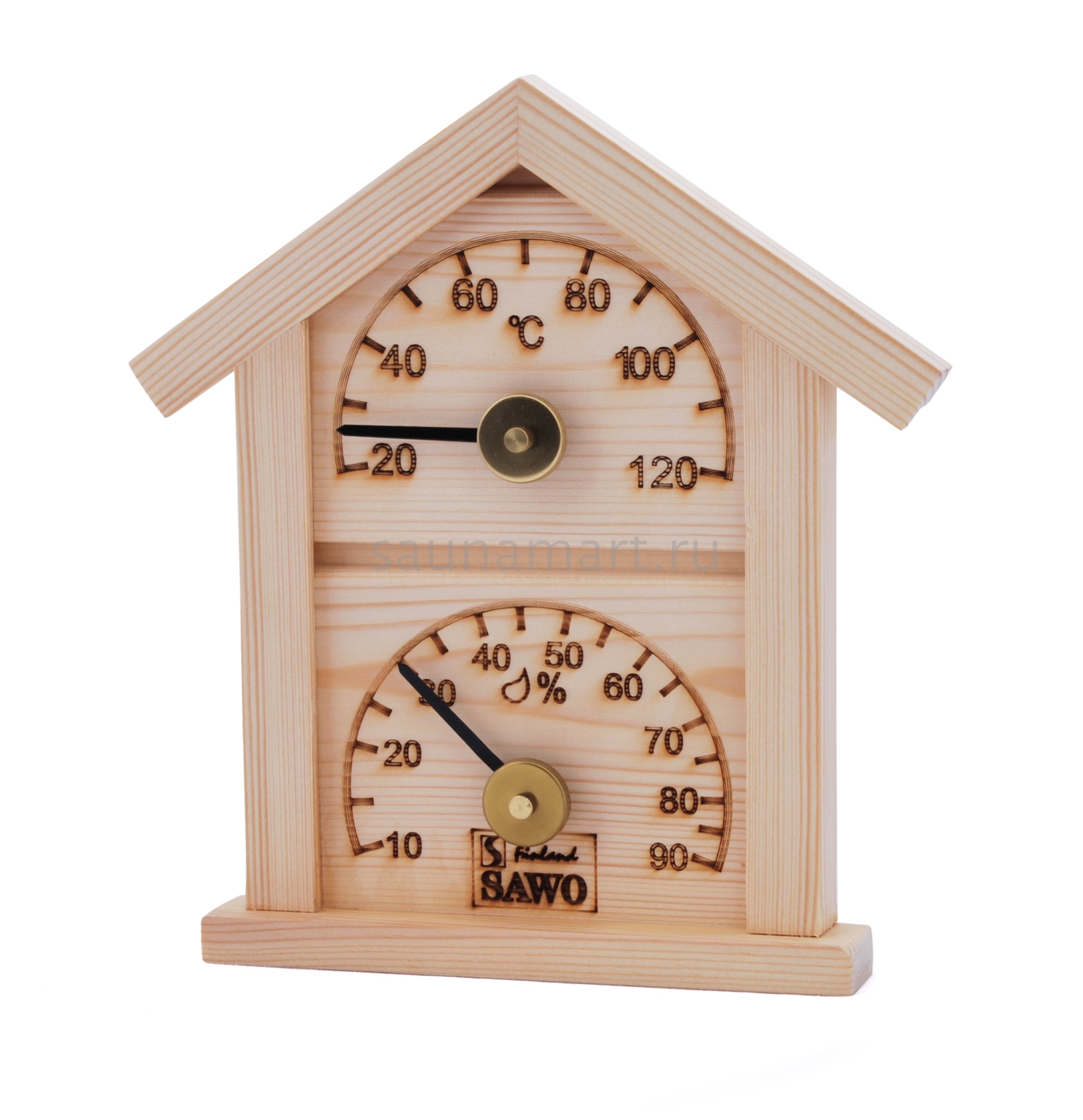 SAWO Термогигрометр 126-THР Высококачественный измерительный прибор для бани и сауны позволяет одновременно контролировать влажность и температуру в сауне. Корпус прибора выполнен из пиломатериалов лиственных пород. Термогигрометр впишется в интерьер любой сауны, украсив его. Температурная шкала термометра от 20 до 120 градусов. Размер - 180х200 мм Материал: сосна Производитель: Финляндия