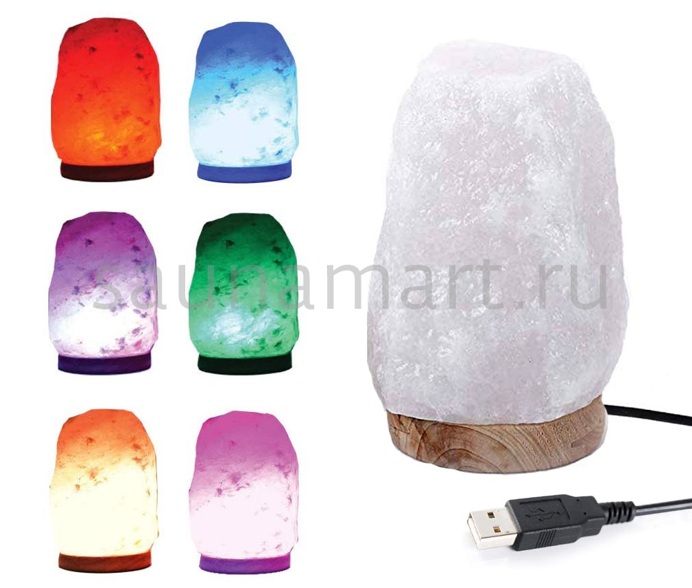 Гималайская соляная лампа с деревянной подставкой, многоцветная с изменением цвета на 7 цветов. Эта солевая мини лампа с USB разъемом для питания от порта компьютера сделана из настоящей Гималайской соли.