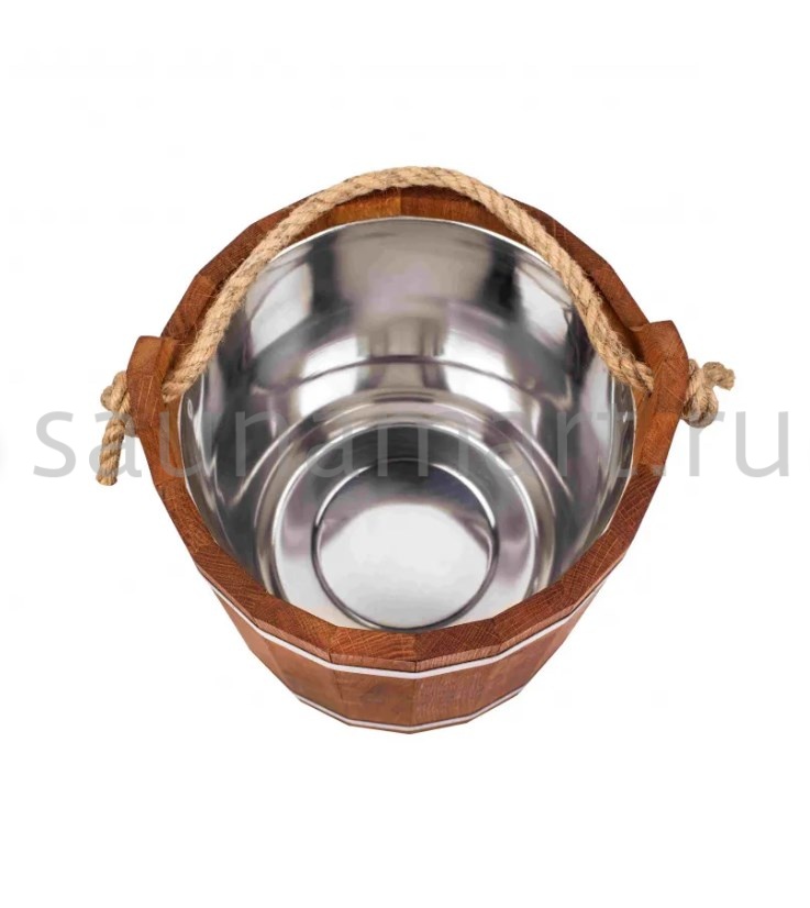 Отлично подходит для хранения и переноски воды, настоя трав, запарки веников. Вставка из пластика обеспечит удобный уход. Ведро оснащено удобной ручкой из толстой бечевы. Наружная часть изделия обрамлена металлическими обручами для надежности конструкции.
