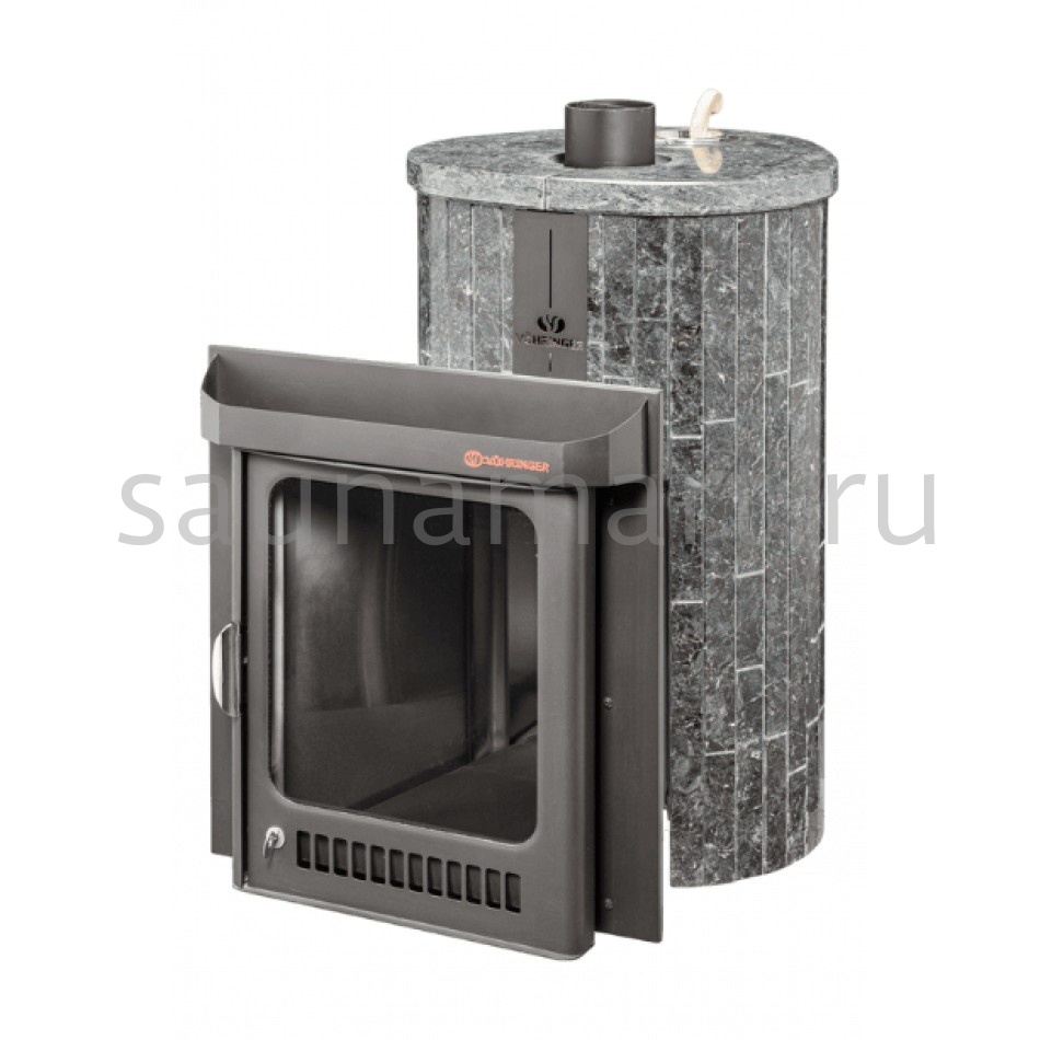 Для печи «Оптима» серии ПФ производитель V?hringer выпускает порталы из натурального мрамора, змеевика и жадеита. Облицовочные материалы поступают на завод в слэбах, заготовки разрезают на пластины, которые затем навешивают на печь.